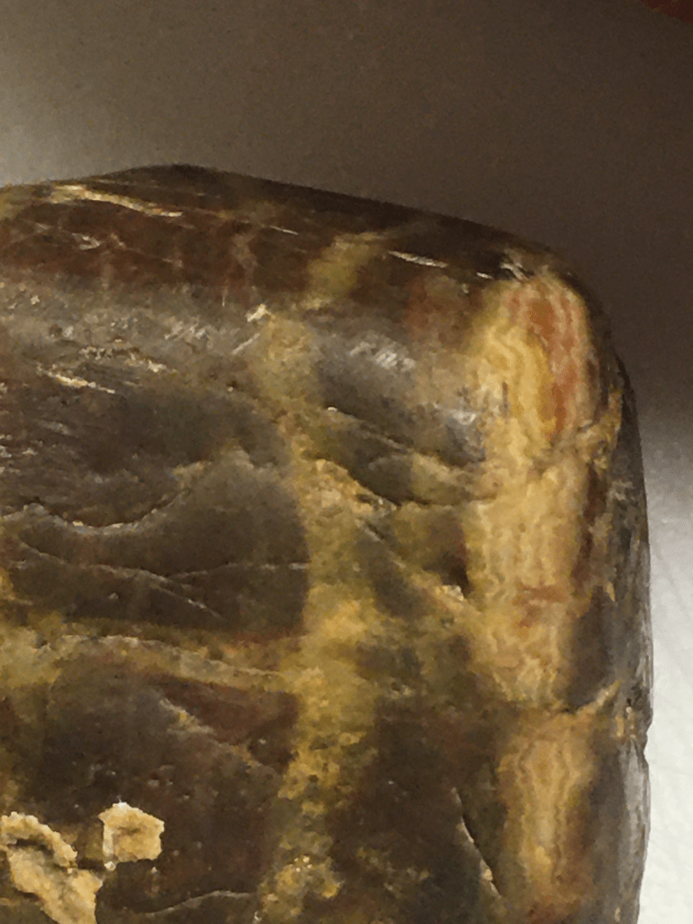 My meat chunk rock just didn’t happen through some “volcanic” and or “heat and pressure” process. Not only can I detect some of the outer layer of skin, but the fascia in various layers is plain to the eye. Upon close examination with magnifiers even areas of red blood can be seen! It is quite remarkable. In one of Roger’s videos he does a chemical test using hydrogen peroxide. A catalase reaction occurs when the HP encounters blood or residual blood elements. And what do you know? After I dug/ scraped into one of the crevices on the rock, the reaction I was looking for happened! Catalase positive! Blood in there…